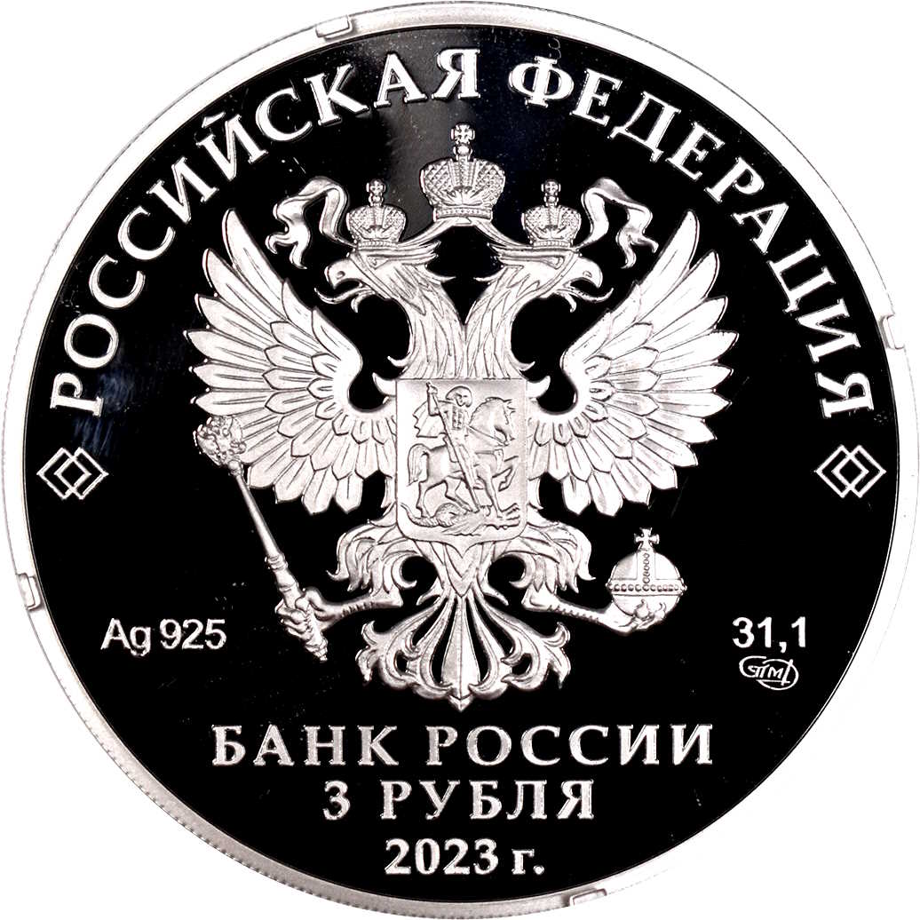 Опис: На аверсі монети зображено рельєфний герб Російської Федерації та написи «РОССИЙСКАЯ ФЕДЕРАЦИЯ» (РОСІЙСЬКА ФЕДЕРАЦІЯ) і «БАНК РОССИИ» (БАНК РОСІЇ), номінал монети «3 РУБЛЯ» (3 РУБЛЯ), рік випуску «2023 г.» (2023), хімічний символ металу за періодичною таблицею Менделєєва, проба, знак Санкт-Петербурзького монетного двору та вміст дорогоцінного металу.