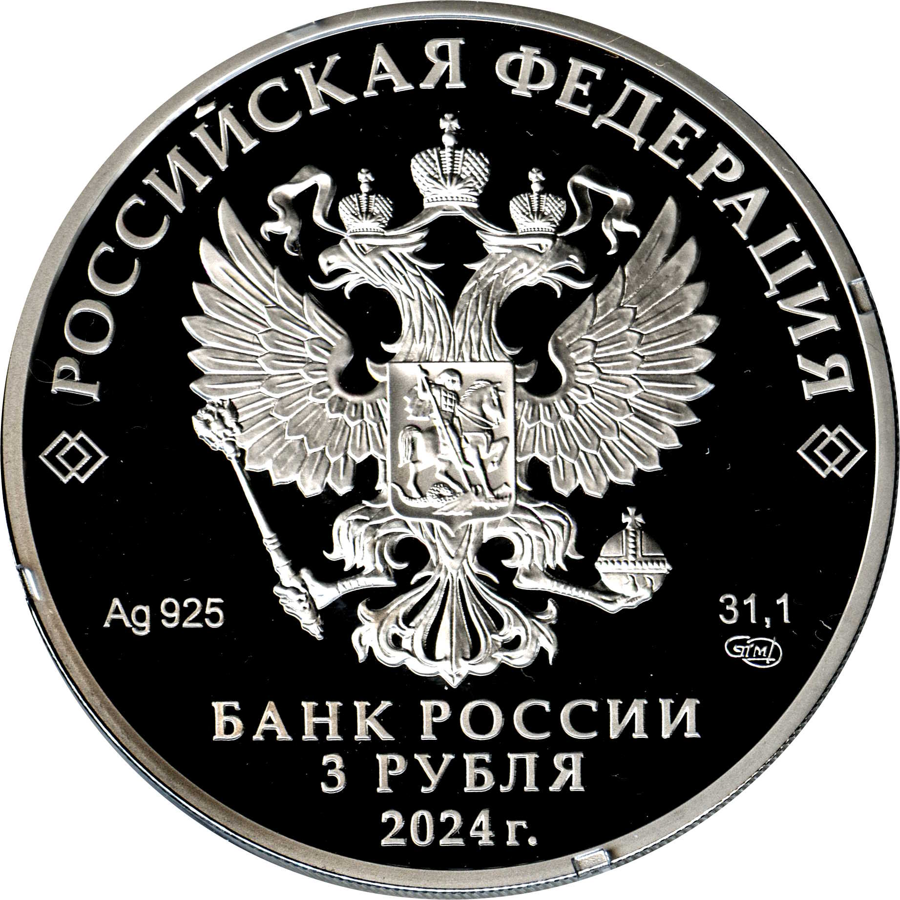 Опис: На аверсі монети зображено рельєфний герб Російської Федерації та написи «РОССИЙСКАЯ ФЕДЕРАЦИЯ» (РОСІЙСЬКА ФЕДЕРАЦІЯ) і «БАНК РОССИИ» (БАНК РОСІЇ), номінал монети «3 РУБЛЯ» (3 РУБЛЯ), рік випуску «2024 г.» (2024), хімічний символ металу за періодичною таблицею Менделєєва, пробу, знак Санкт-Петербурзького монетного двору та вміст дорогоцінного металу.