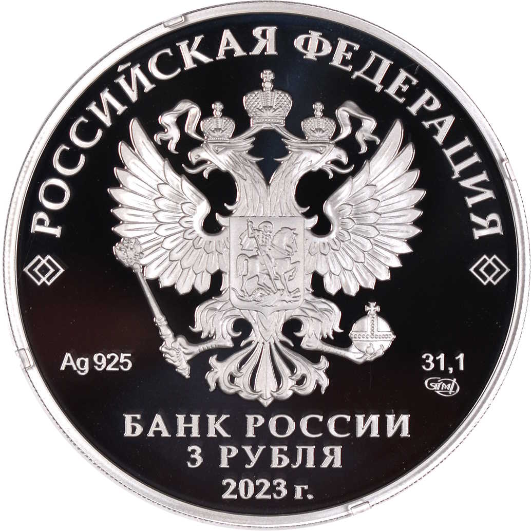Опис: На аверсі монети зображено рельєфний герб Російської Федерації та написи «РОССИЙСКАЯ ФЕДЕРАЦИЯ» (РОСІЙСЬКА ФЕДЕРАЦІЯ) і «БАНК РОССИИ» (БАНК РОСІЇ), номінал монети «3 РУБЛЯ» (3 РУБЛЯ), рік випуску «2023 г.» (2023), хімічний символ металу за періодичною таблицею Менделєєва, проба, знак Санкт-Петербурзького монетного двору та вміст дорогоцінного металу.