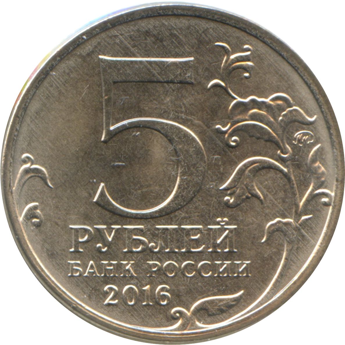 Опис: У центрі — зазначення номіналу монети у двох рядках: «5 РУБЛЕЙ», нижче — напис: «БАНК РОССИИ» (БАНК РОСІЇ), під ним – рік випуску: «2016», ліворуч і праворуч – стилізована гілка рослини, праворуч по краю – знак монетного двору.