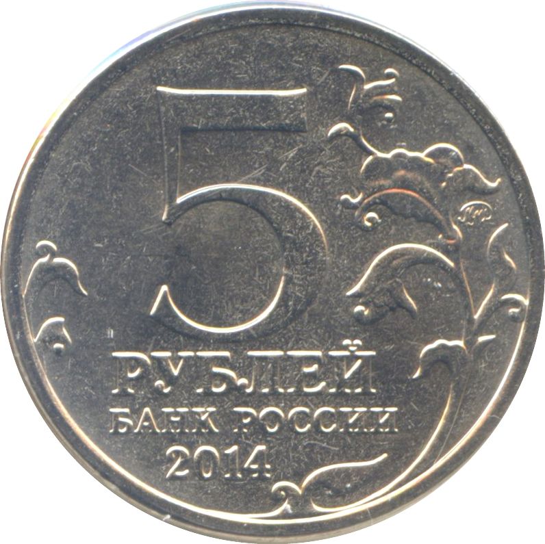 Опис: У центрі — позначення номіналу монети: «5 РУБЛЕЙ», нижче — напис: «БАНК РОССИИ» (БАНК РОСІЇ), під ним – рік випуску: «2014», ліворуч і праворуч – стилізована гілка рослини, праворуч по краю – знак монетного двору.