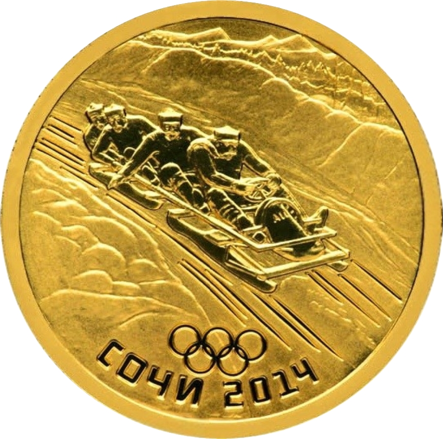 Опис: У центрі матового диска — рельєфне зображення чотирьох спортсменів у бобслейному санях, що мчать по трасі, обрамленій з обох боків сніговими заметами. На задньому плані — далекі гори, нижче — п'ять олімпійських кілець, під ними по краю — напис, виконаний технікою «пруф»: «СОЧИ 2014» (SOCHI 2014).
