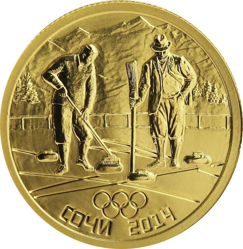 Опис: У центрі матового диска — двоє спортсменів на льодовому полі, біля них — чотири камені (ключки), один із спортсменів ліворуч полірує лід перед каменем, інший праворуч стоїть із щіткою в руці, на задньому плані — засніжені гори, біля їх підніжжя праворуч і ліворуч — кілька хвойних дерев; внизу - п'ять олімпійських кілець, під ними - напис, виконаний технікою «проба»: «СОЧИ 2014» (СОЧІ 2014).