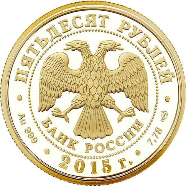Опис: У центрі — емблема Банку Росії [двоголовий орел із опущеними крилами, під ним — напівкруглий напис «БАНК РОССИИ» (БАНК РОСІЇ)] в обрамленні кола з крапок і написів по краю — зверху: «ПЯТЬДЕСЯТ РУБЛЕЙ» (П'ЯТДЕСЯТ РУБЛІВ), знизу: ліворуч – позначення дорогоцінного металу та його проби, в центрі – рік випуску «2015 г.» (2015), праворуч – вміст дорогоцінного металу та знак монетного двору.