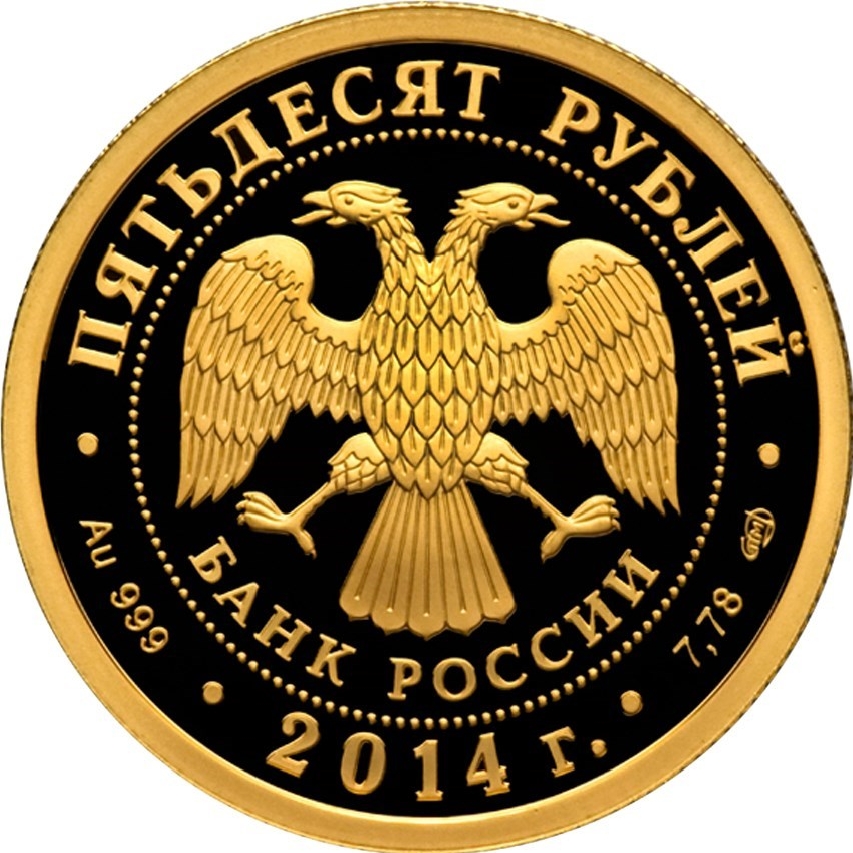 Опис: У центрі — емблема Банку Росії [двоголовий орел із опущеними крилами, під ним — напівкруглий напис «БАНК РОССИИ» (БАНК РОСІЇ)], обрамлена колом з крапок і написів по краю — зверху: «ПЯТЬДЕСЯТ РУБЛЕЙ» (П'ЯТДЕСЯТ РУБЛІВ), нижче: ліворуч - позначення дорогоцінного металу та його проби, в центрі - рік випуску, праворуч - вміст дорогоцінного металу та знак монетного двору.