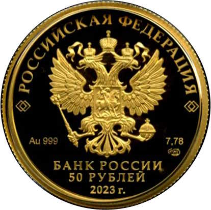 Опис: На дзеркальній поверхні диска зображено рельєфний герб Російської Федерації, над ним по краю розміщено напівкруглий напис «РОССИЙСКАЯ ФЕДЕРАЦИЯ» (РОСІЙСЬКА ФЕДЕРАЦІЯ), обрамлений з обох боків подвійними ромбами, під гербом зліва вказано дорогоцінний метал і його пробу, а праворуч — вміст дорогоцінного металу і знак монетного двору, внизу по центру трьома рядками розміщено напис «БАНК РОССИИ» (БАНК РОСІЇ), номінал монети і рік випуску «2023 г.» (2023).