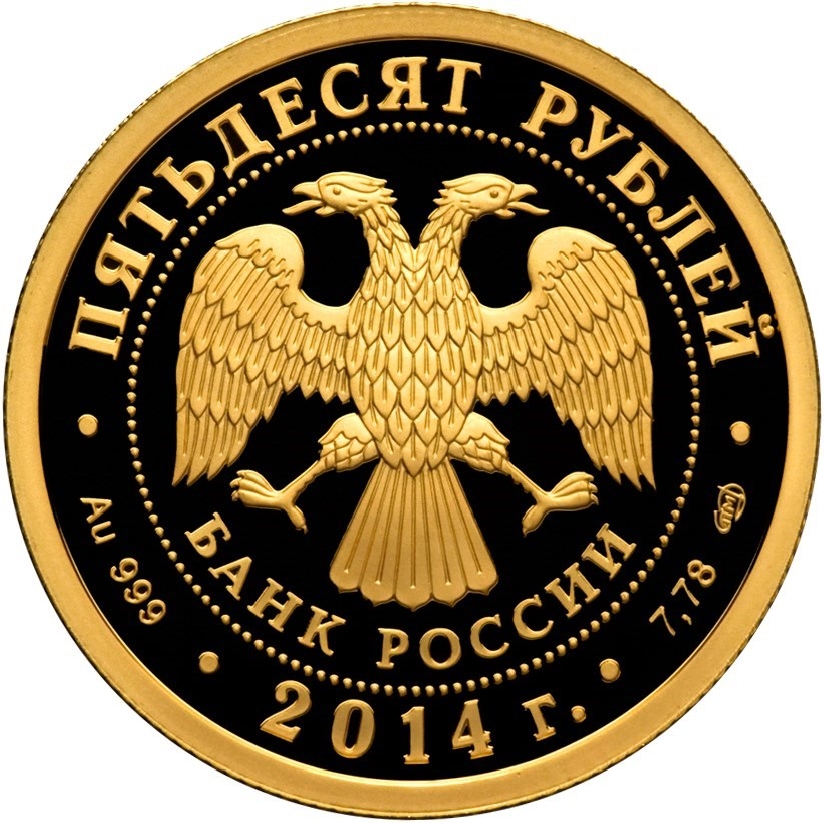 Опис: У центрі — емблема Банку Росії [двоголовий орел із опущеними крилами, під ним — напівкруглий напис «БАНК РОССИИ» (БАНК РОСІЇ)], обрамлена колом з крапок і написів по краю — зверху: «ПЯТЬДЕСЯТ РУБЛЕЙ» (П'ЯТДЕСЯТ РУБЛІВ), знизу: ліворуч - позначення дорогоцінного металу та його проби, в центрі - рік випуску, праворуч - вміст дорогоцінного металу та знак монетного двору.
