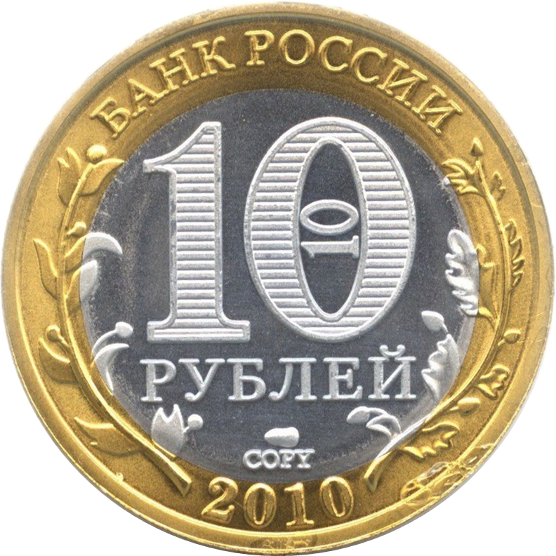 Опис: У центрі диска — зазначення номінальної вартості монети «10 РУБЛЕЙ» (10 РУБЛІВ). Всередині цифри «0» — зображення цифри «10». У верхній частині кільця — напис по колу: «БАНК РОССИИ» (БАНК РОСІЇ), у нижній — рік випуску «2010», ліворуч і праворуч — стилізовані гілки рослин, що переходять на диск.