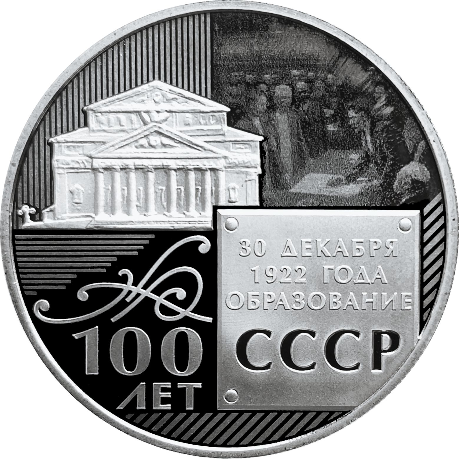 Опис: У верхній частині медалі зображено історичну подію: підписання Угоди про утворення Радянського Союзу на Першому з'їзді Рад. Зліва — рельєфне зображення фасаду Большого театру, де відбулося підписання. Справа — картина Степана Дудника, що зображує саме підписання, створена за допомогою технології лазерного матування. У нижній частині медалі — написи.