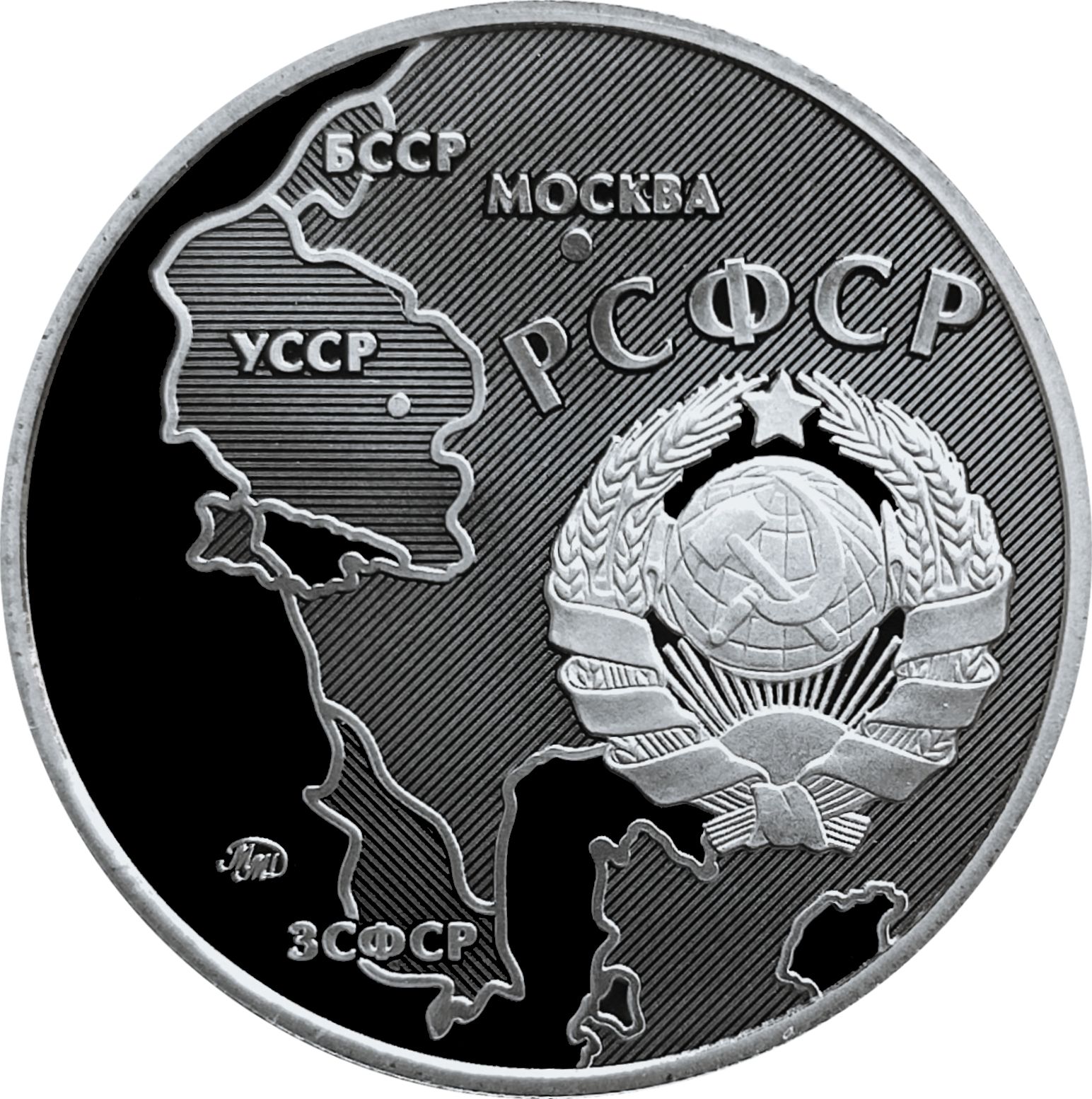 Опис: Герб СРСР зображений на тлі карти СРСР, на якій виділені республіки: БРСР (Білоруська РСР), УкрРСР (Українська РСР), РРФСР (Російська Радянська Федеративна Соціалістична Республіка) та ЗСФСР (Закавказька Соціалістична Федеративна Радянська Республіка).