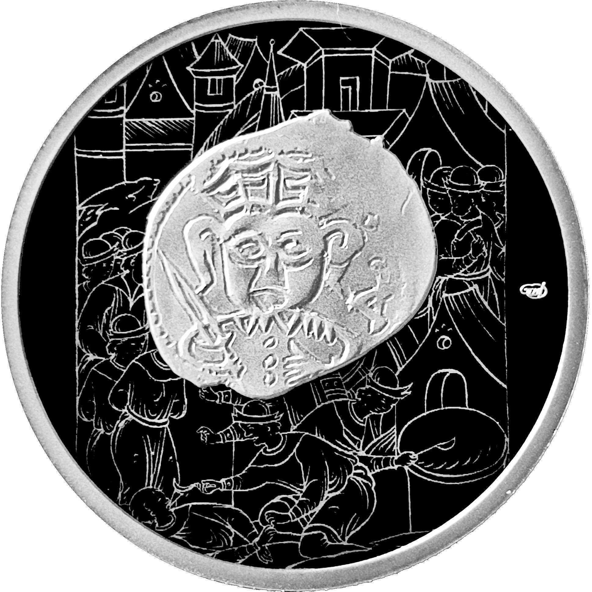 Опис: Рельєфне зображення псковської монети XV століття з фігурою князя Довмонта (покровителя міста). Фонове зображення — фрагмент мініатюри з «Ілюстрованої хроніки» XVI століття, що ілюструє страту фальшивомонетників у Русі, виконаний за допомогою лазерного матування.