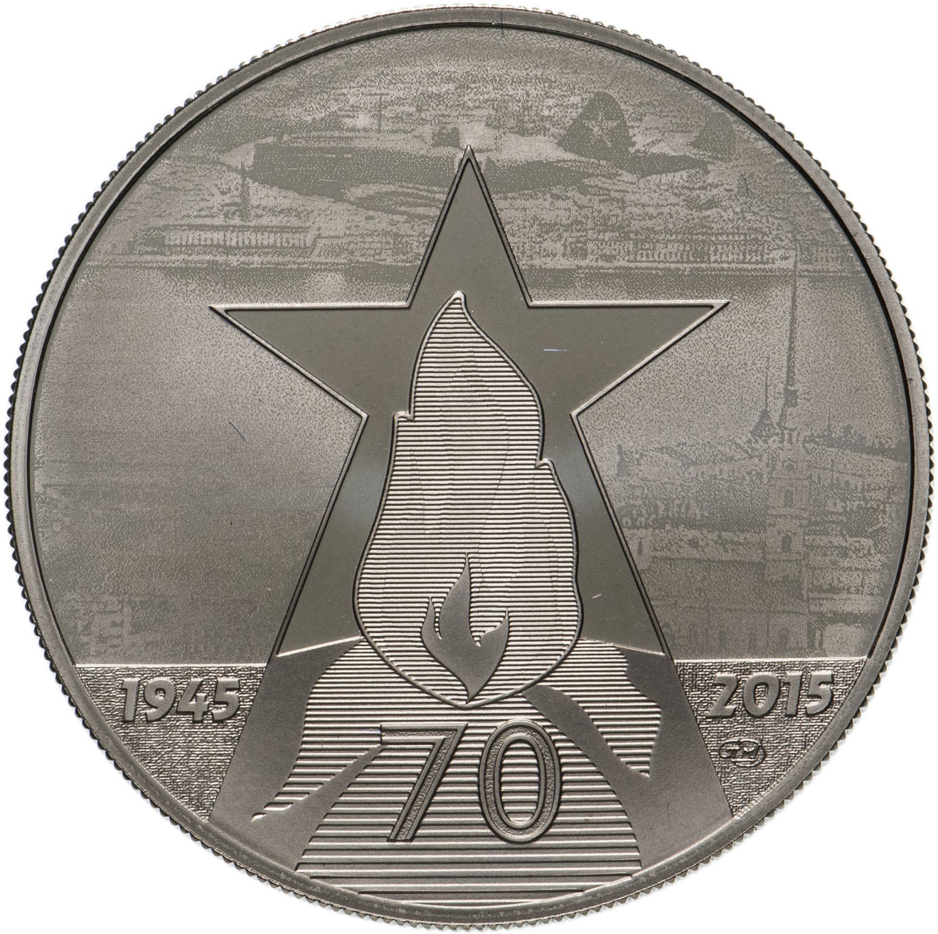 Опис: На зворотному боці медалі, в центральній частині, на растровому полі, зображено Вічний вогонь, який змінює свої обриси залежно від кута зору до площини жетона. Нижче розміщено цифру «70». Зображення Вічного вогню та цифри «70» обрамлені контуром у вигляді п'ятикутної зірки. Навколо зірки зображено радянський військовий літак Як-3 на тлі панорами Петропавлівської фортеці та Дворцової набережної. У нижній частині, ліворуч і праворуч від пам'ятника Вічному вогню, розміщені дати «1945» і «2015».