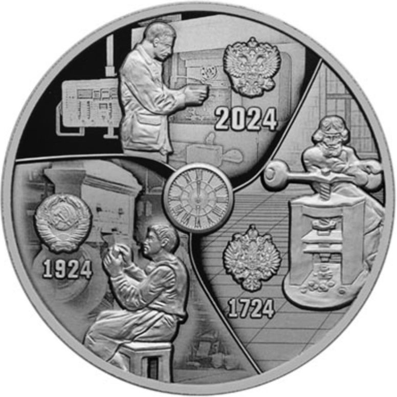 Опис: Зображено три епохи історії карбування монет, а в центрі — циферблат годинника, що символізує безперервність часу. Царські часи: гвинтовий прес, майже вся робота в 18 столітті виконувалася вручну, а також герб Російської імперії та дата 1724 рік. Радянські часи: у 20 столітті на монетній дільниці з'явилася механізація. Кількість ручних операцій зменшується, трудомісткі роботи виконуються механізмами, а також герб Радянського Союзу і дата 1924 рік. Сучасність: Більшість операцій автоматизовано. На відміну від монетників минулого, його головне завдання — контролювати правильність операцій, що виконуються обладнанням, а також герб Російської Федерації і дата 2024 рік.