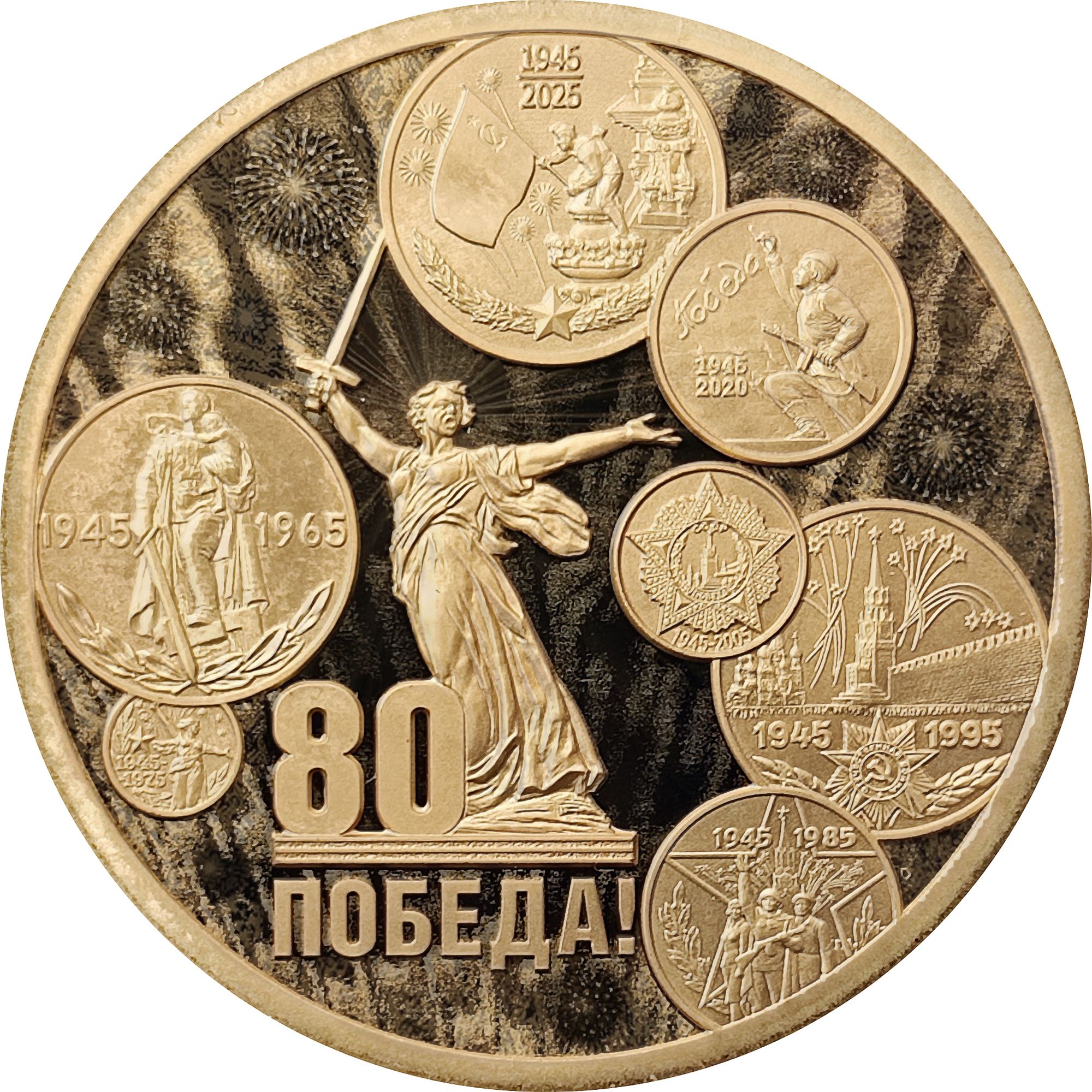 Опис: Пам'ятник «Батьківщина кличе!» зображений на тлі святкового феєрверку та зображень ювілейних медалей Монетного двору, присвячених Великій Перемозі 1945 року.
