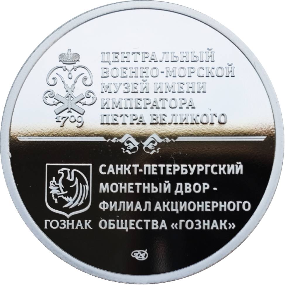Опис: Логотип Центрального морського музею імені імператора Петра Великого (у вигляді монограми Петра I та дати заснування 1709), логотип Гознак, знак монетного двору та написи.