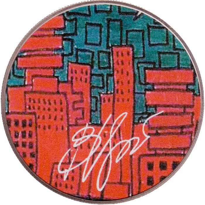 Опис: Білий автограф Віктора Цоя на тлі стилізованого, намальованого від руки міського пейзажу в червоних і бірюзових тонах.