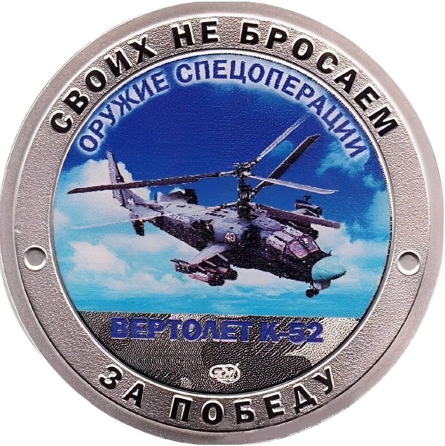 Опис: Кольорове зображення Ka-52 Alligator, російського розвідувального та ударного вертольота нового покоління, знак монетного двору та написи. Машина здатна вражати броньовані та неброньовані транспортні засоби, особовий склад та повітряні цілі на полі бою. Це подальший розвиток вертольота Ka-50 «Чорна акула».