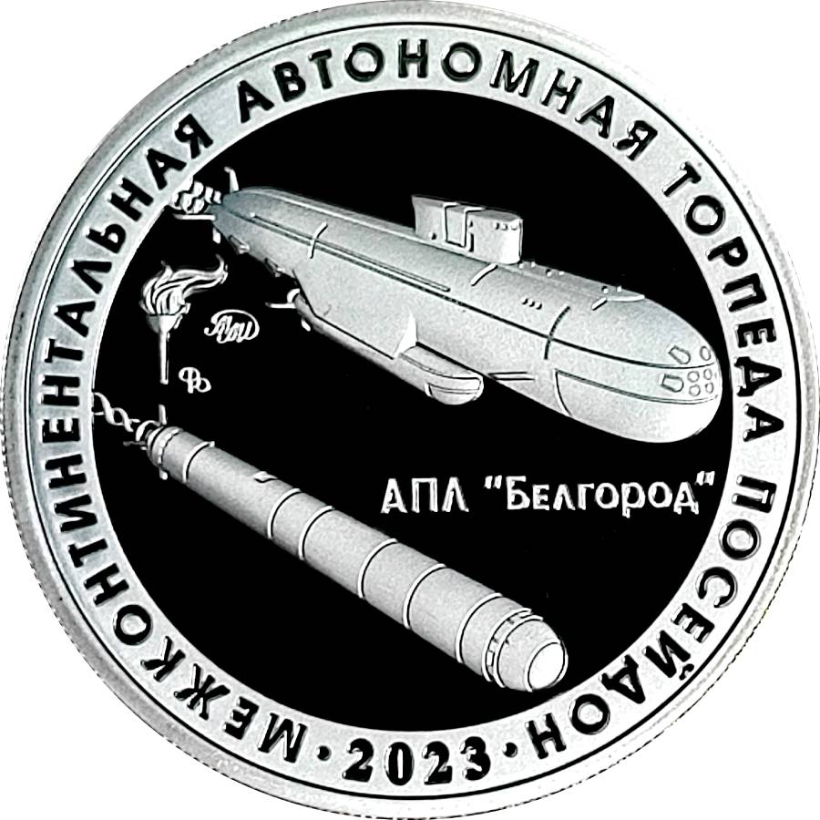 Опис: Атомний підводний човен «Бєлгород» та міжконтинентальна автономна торпеда «Посейдон». Рік випробування вказано внизу, а напис розташований навколо кола.
