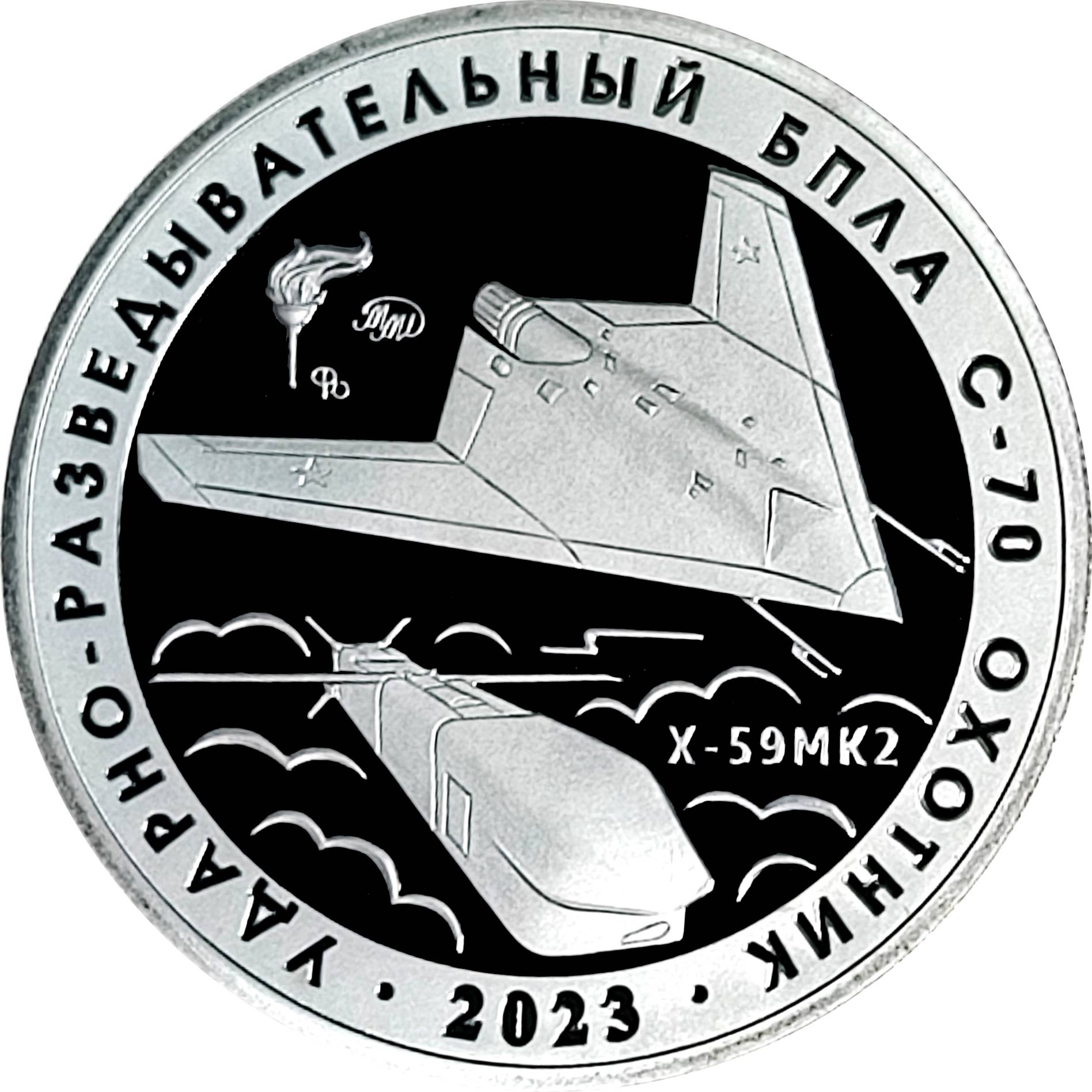 Опис: Важкий ударний і розвідувальний безпілотний літальний апарат S-70 «Охотник» та крилата ракета Х-59МК2. Рік випробувань вказано внизу, напис навколо кола.