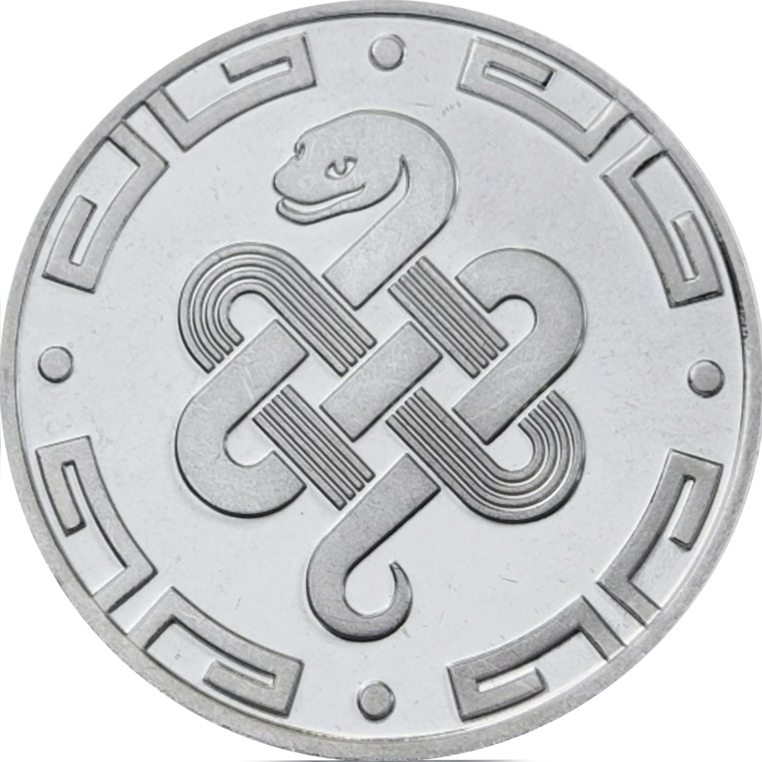 Опис: У центрі монети зображено стилізовану змію, тіло якої переплітається у візерунок, що нагадує символ серця.