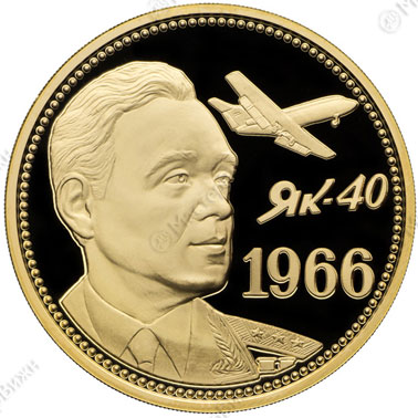 Опис: Портрет авіаконструктора А. С. Яковлєва та перший у світі реактивний літак для місцевих ліній YAK 40, випробування якого розпочалося в 1966 році.