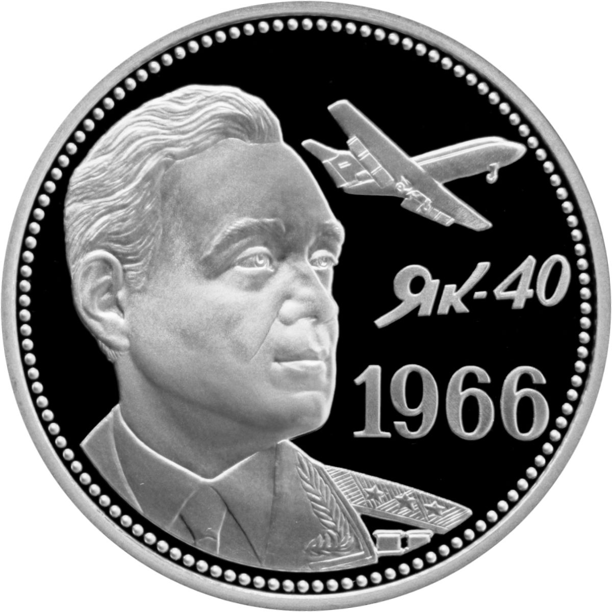 Опис: Портрет авіаконструктора А. С. Яковлєва та перший у світі реактивний літак для місцевих ліній YAK 40, випробування якого розпочалося в 1966 році.