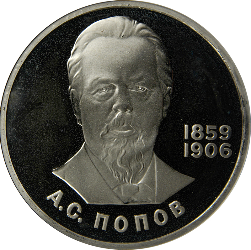 Опис: Бюст Олександра Попова, а праворуч — рік його народження та смерті «1859» і «1906». Внизу — напівкруглий напис «A.S. POPOV». Олександр Степанович Попов — російський фізик, який першим розробив практичне застосування радіоелектромагнітних хвиль.