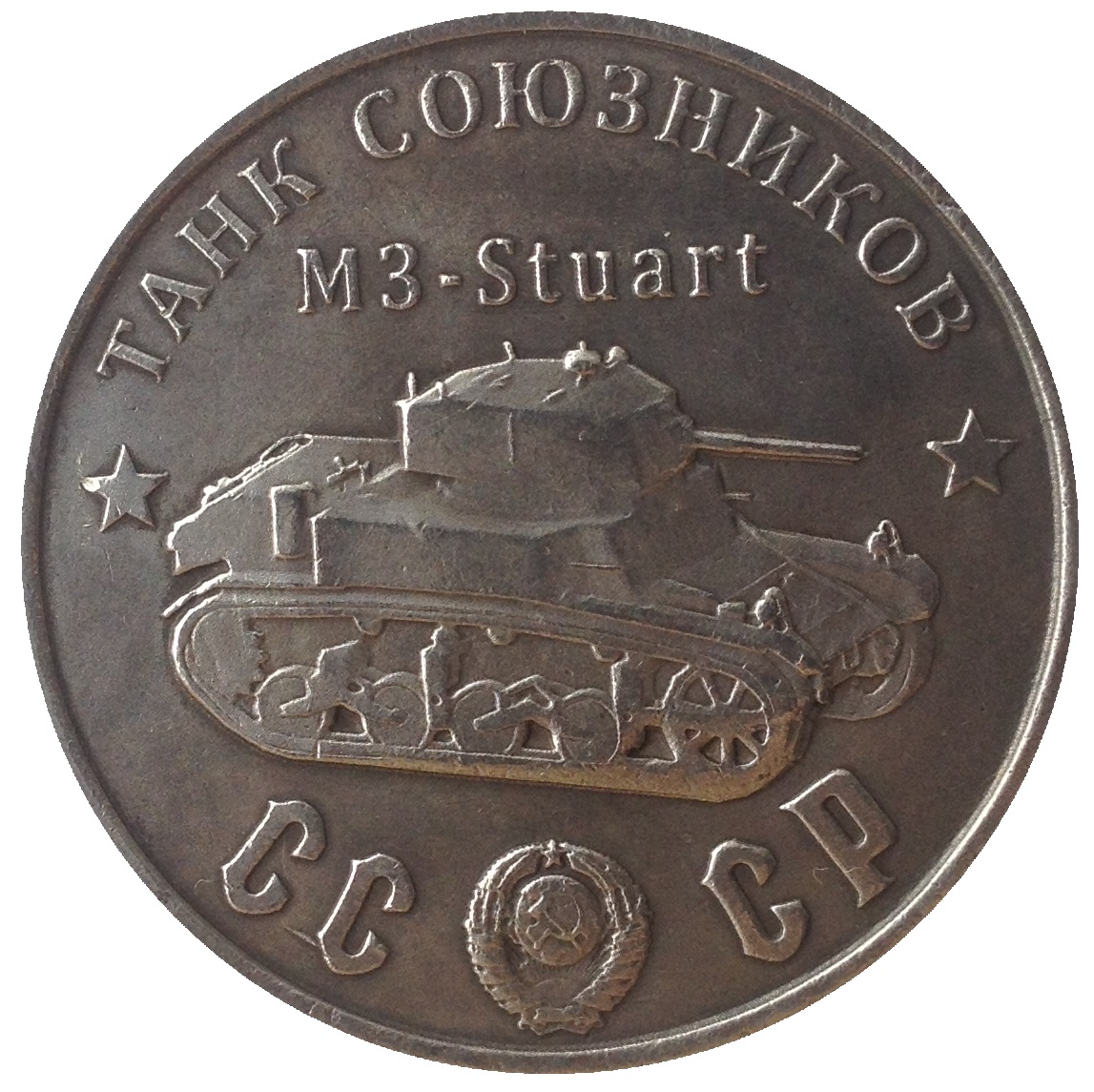 Опис: Назва серії танків у верхній частині; танк союзників M3-Stuart; герб СРСР між літерами CC і CP.