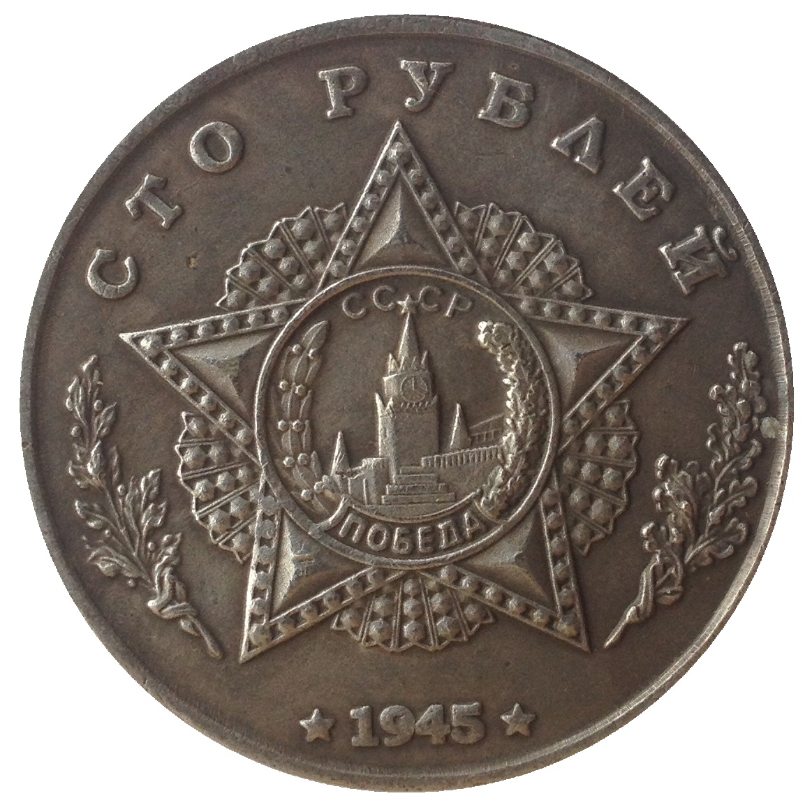Опис: Номінал зверху; Орден Перемоги, а в його центрі зображені стіна Московського Кремля, Спаська вежа та Мавзолей Леніна, оточені лавровими та дубовими гілками; рік внизу.