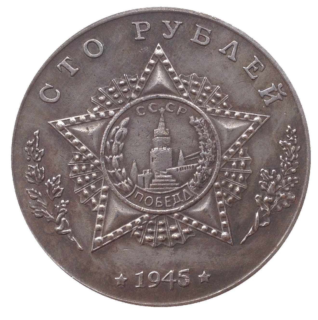 Опис: Номінал зверху; Орден Перемоги, а в його центрі зображені стіна Московського Кремля, Спаська вежа та Мавзолей Леніна, оточені лавровими та дубовими гілками; рік внизу.