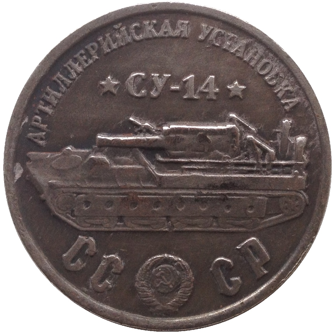 Опис: Назва серії танків у верхній частині; радянська протитанкова гармата СУ-14; герб СРСР між літерами CC і CP.