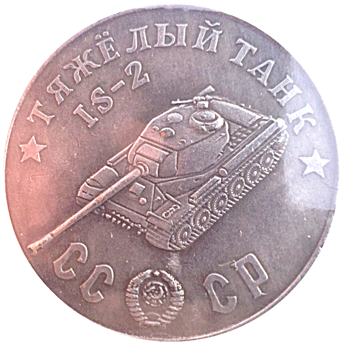 Опис: Назва серії танків у верхній частині; радянський важкий танк ІС-2; герб СРСР між літерами CC і CP.