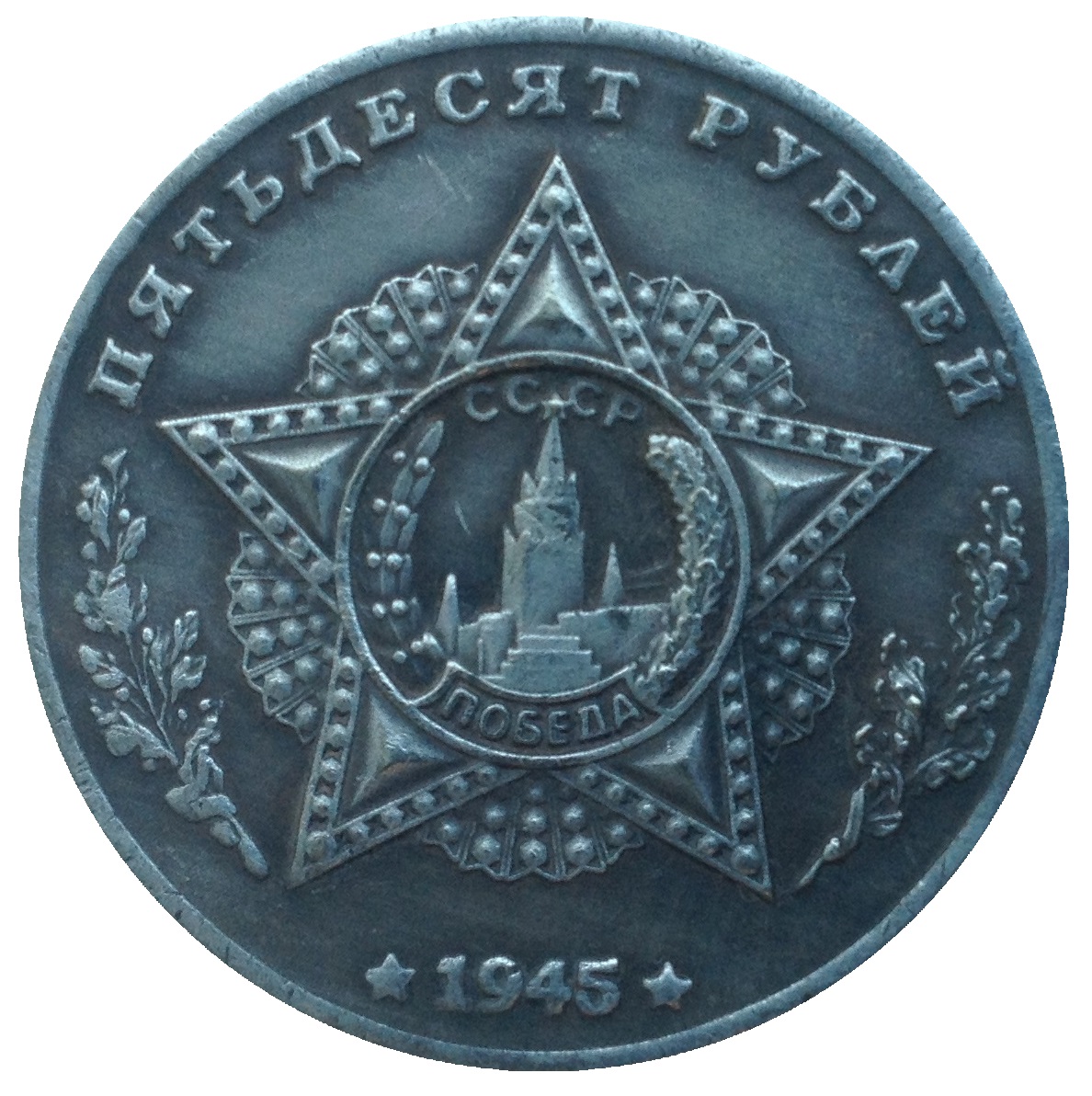 Опис: Номінал зверху; Орден Перемоги, а в його центрі зображені стіна Московського Кремля, Спаська вежа та Мавзолей Леніна, оточені лавровими та дубовими гілками; рік внизу.