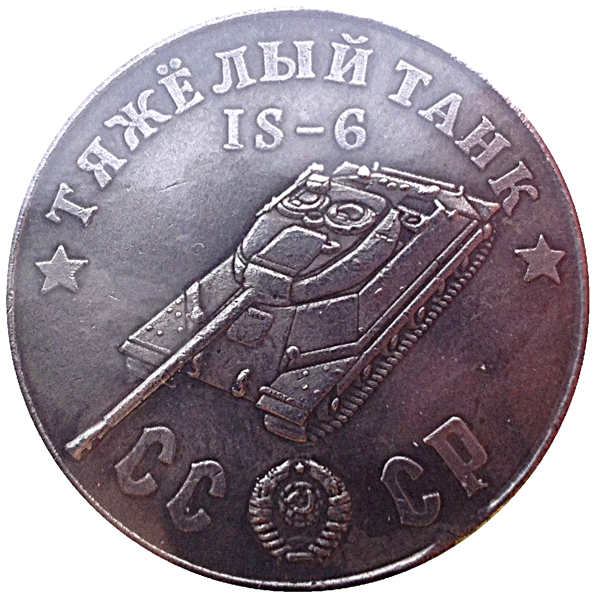Опис: Назва серії танків у верхній частині; радянський важкий танк ІС-6; герб СРСР між літерами CC і CP.