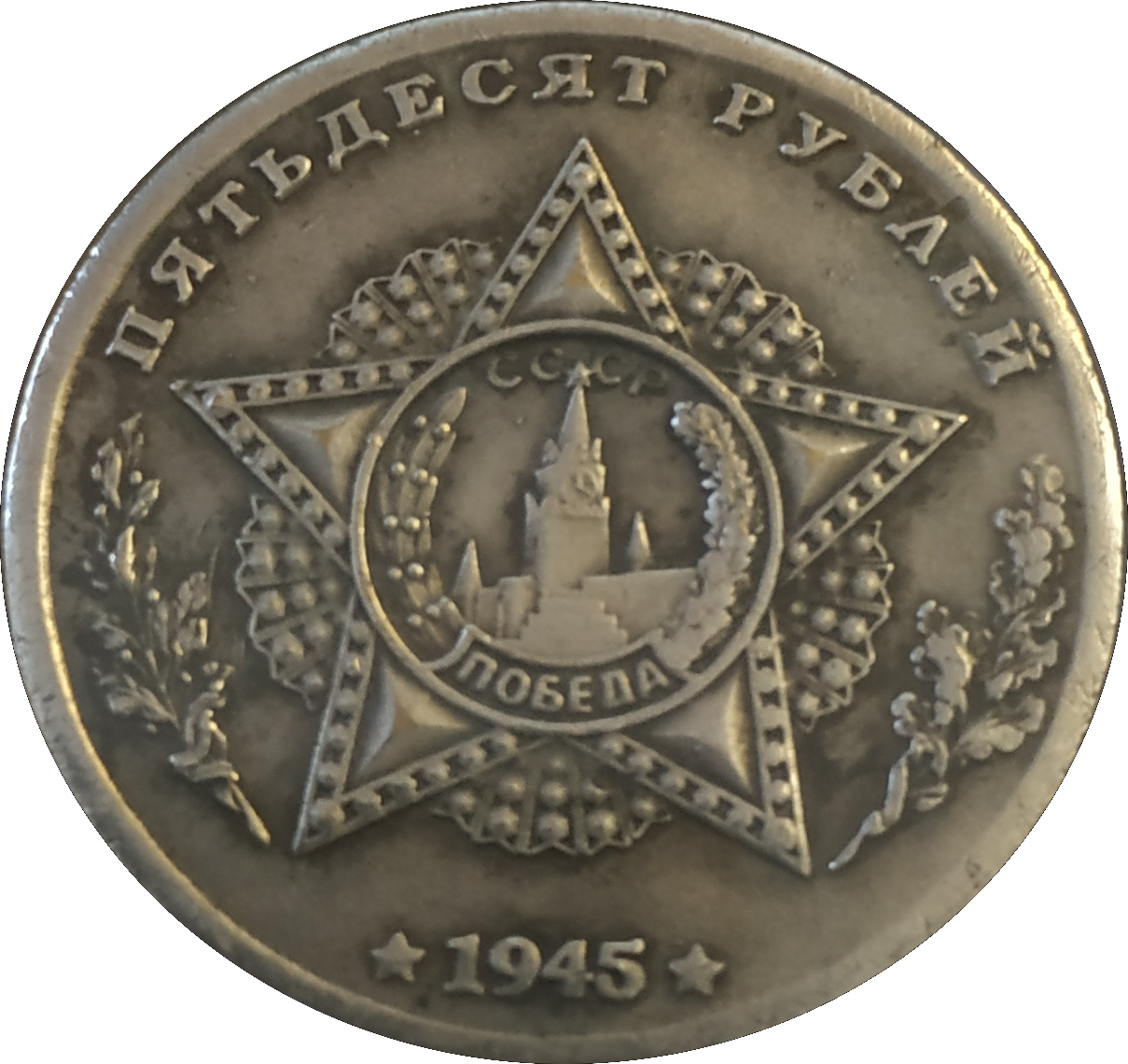 Опис: Номінал зверху; Орден Перемоги, а в його центрі зображені стіна Московського Кремля, Спаська вежа та Мавзолей Леніна, оточені лавровими та дубовими гілками; рік внизу.