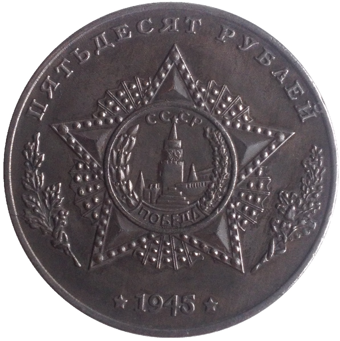 Опис: Номінал зверху; Орден Победы, а в його центрі зображені стіна Московського Кремля, Спаська вежа та Мавзолей Леніна, оточені лавровими та дубовими гілками; рік внизу.