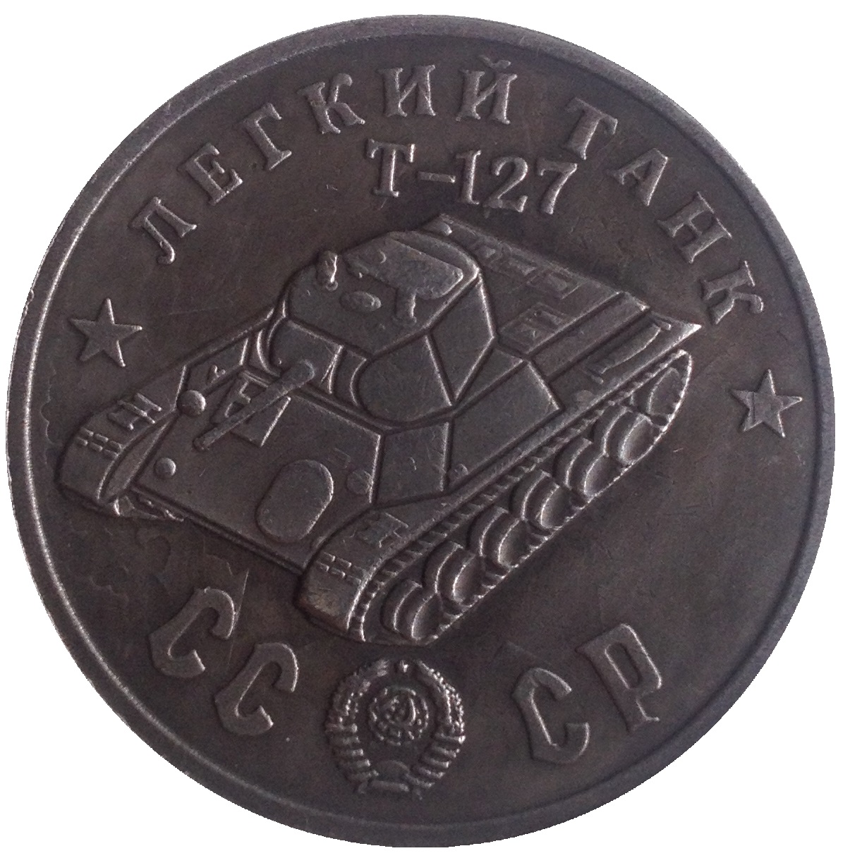 Опис: Назва серії танків зверху; Радянський танк Т-127; Герб СРСР між літерами CC і CP