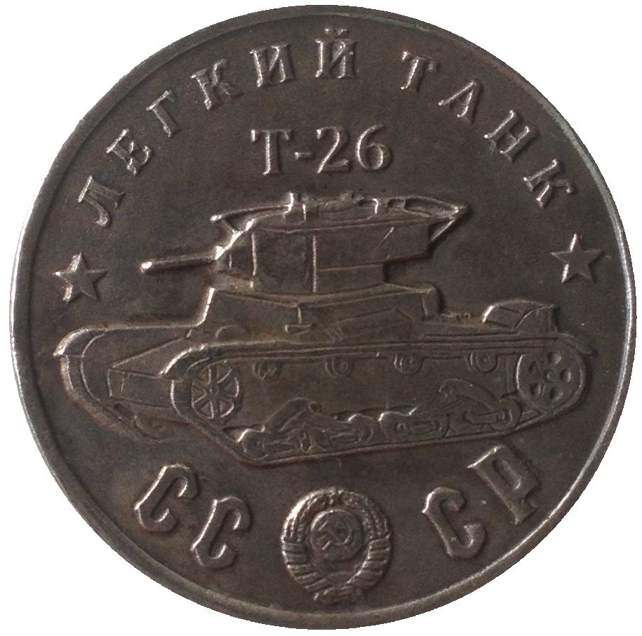 Опис: Назва серії танків у верхній частині; радянський танк Т-26; герб СРСР між літерами CC і CP.