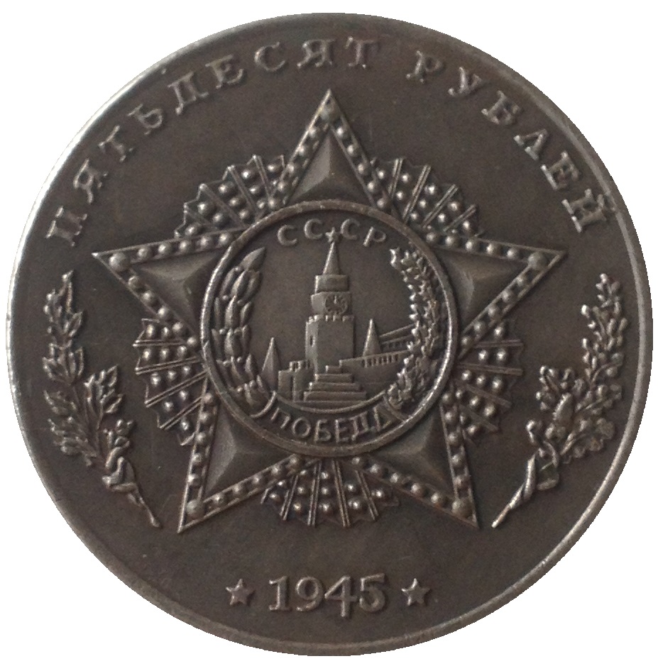 Опис: Номінал зверху; Орден Перемоги, а в його центрі зображені стіна Московського Кремля, Спаська вежа та Мавзолей Леніна, оточені лавровими та дубовими гілками; рік внизу.