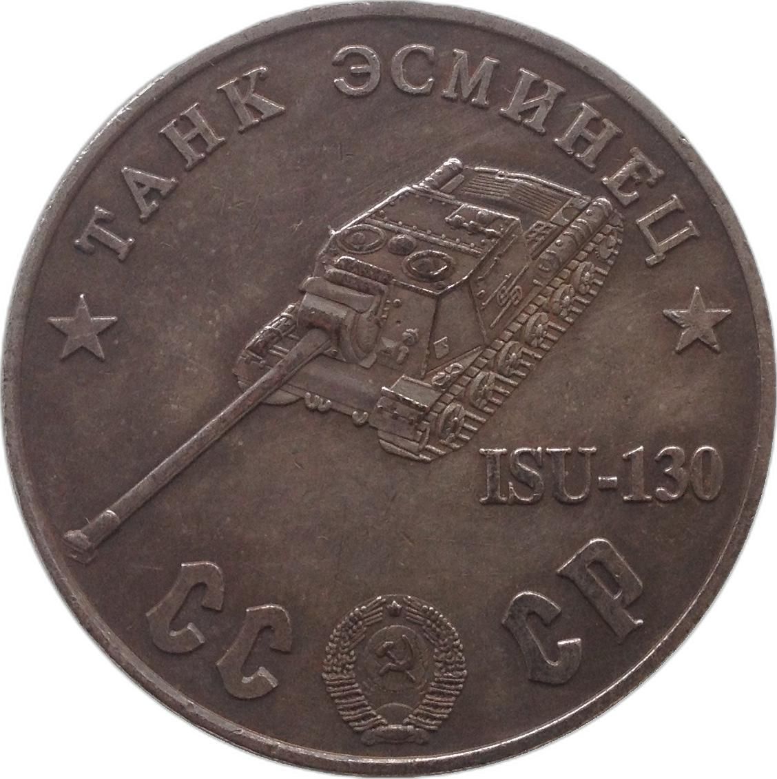 Опис: Назва серії танків у верхній частині; радянський танк-винищувач ISU-130; герб СРСР між літерами CC і CP.