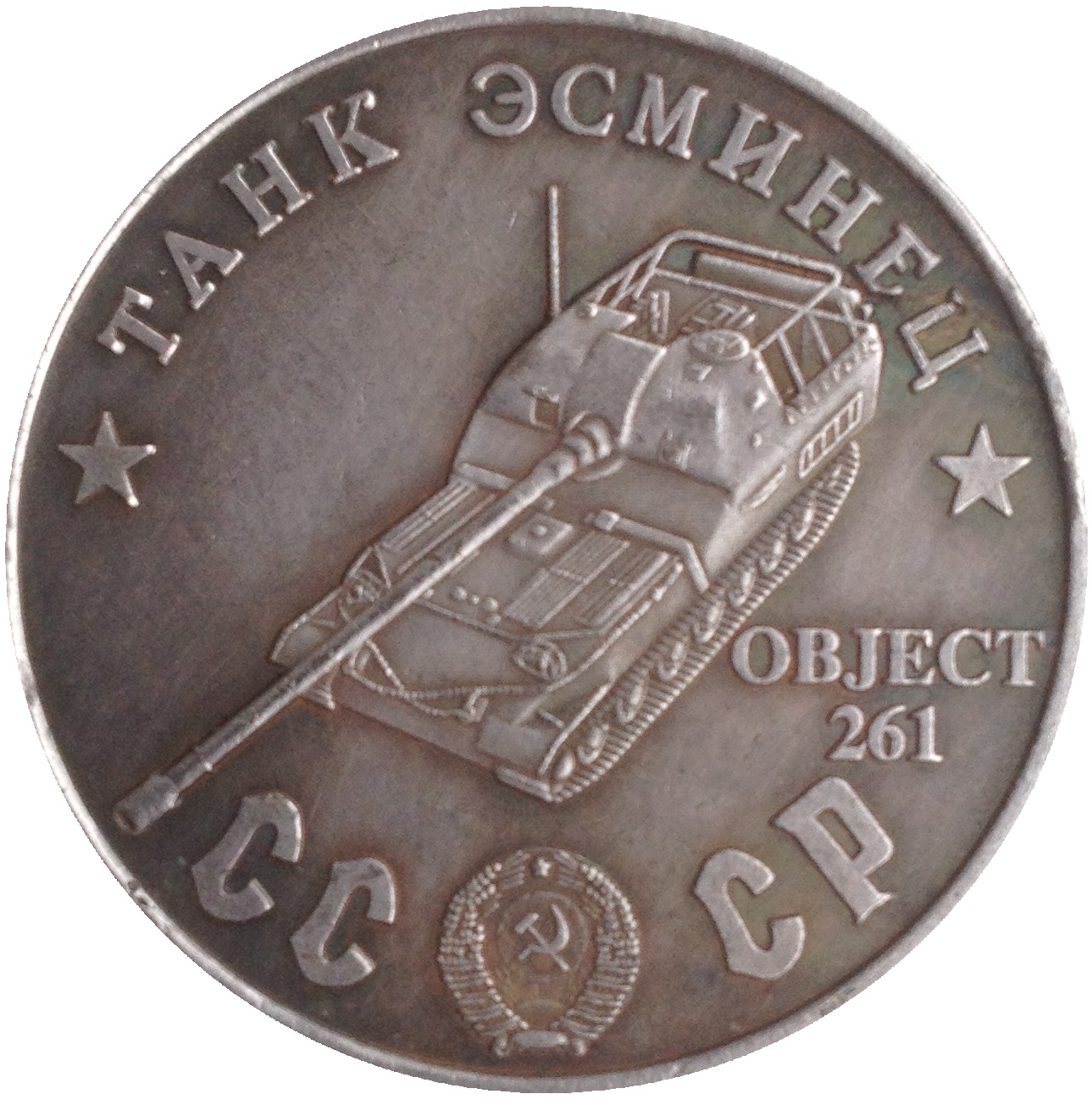 Опис: Назва серії танків у верхній частині; радянський танк-винищувач ОБ'ЄКТ 261; герб СРСР між літерами CC і CP.