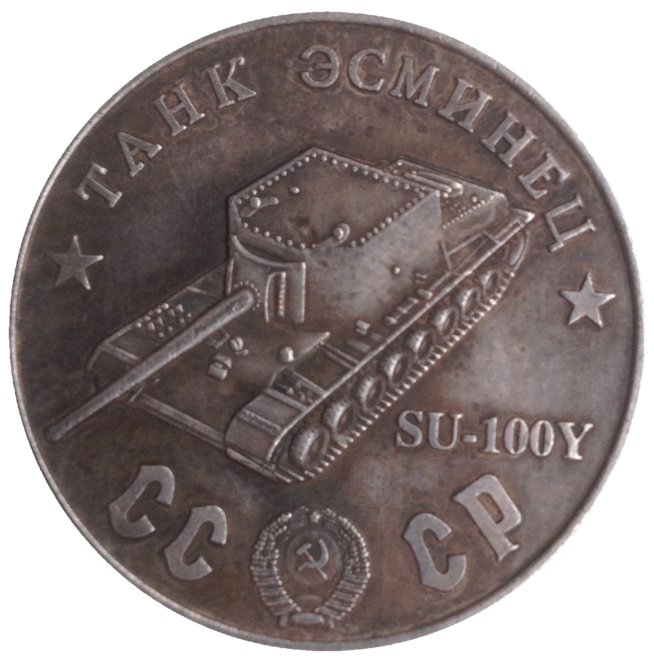 Опис: Назва серії танків у верхній частині; радянський танк-винищувач SU-100Y; герб СРСР між літерами CC і CP.