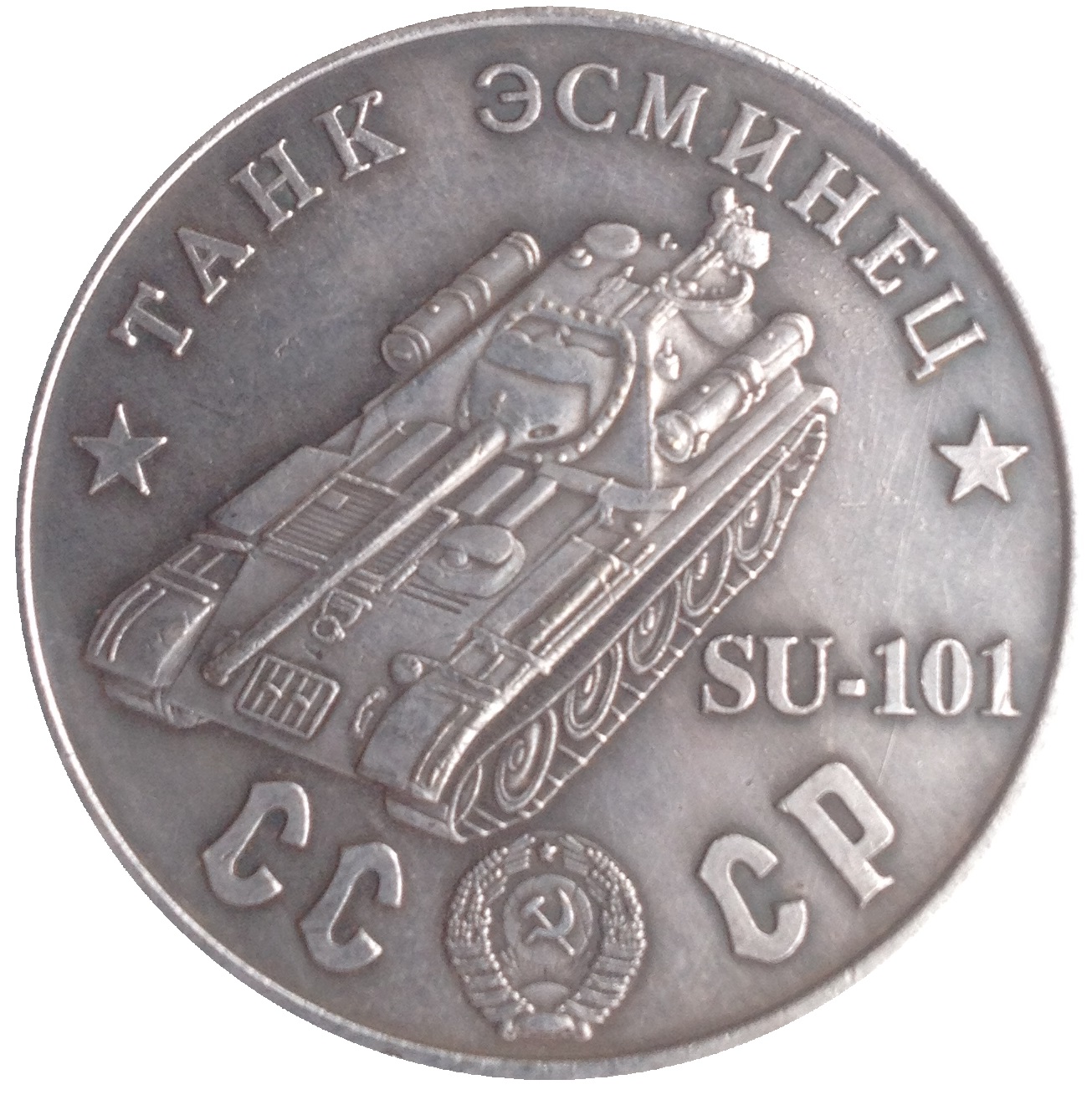 Опис: Назва серії танків зверху; радянський танковий знищувач SU-101; герб СРСР між літерами CC і CP.