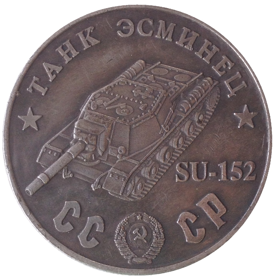Опис: Назва серії танків у верхній частині; радянський танк-винищувач SU-152; герб СРСР між літерами CC і CP.