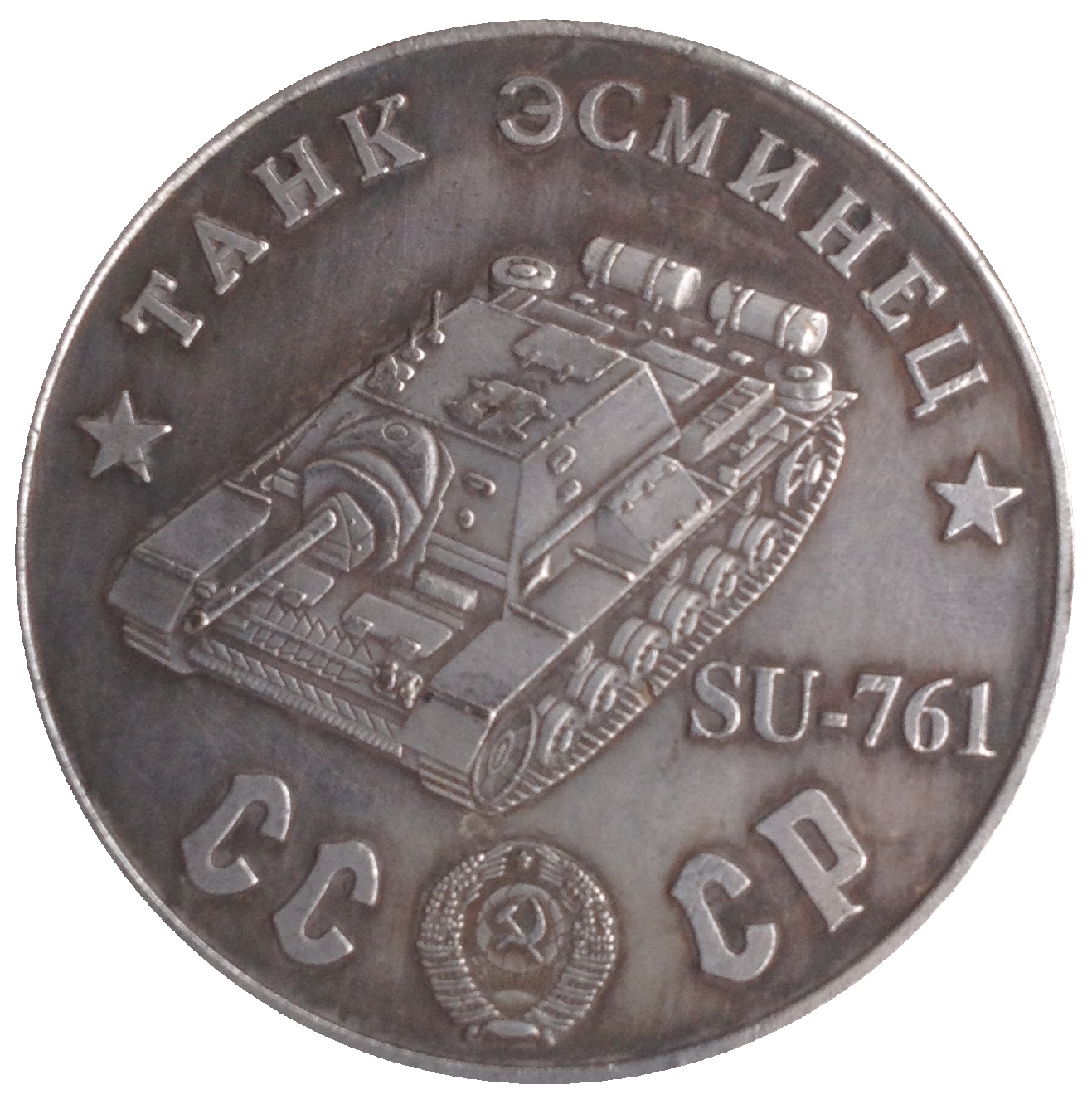 Опис: Назва серії танків у верхній частині; радянський танк-винищувач SU-761; герб СРСР між літерами CC і CP.