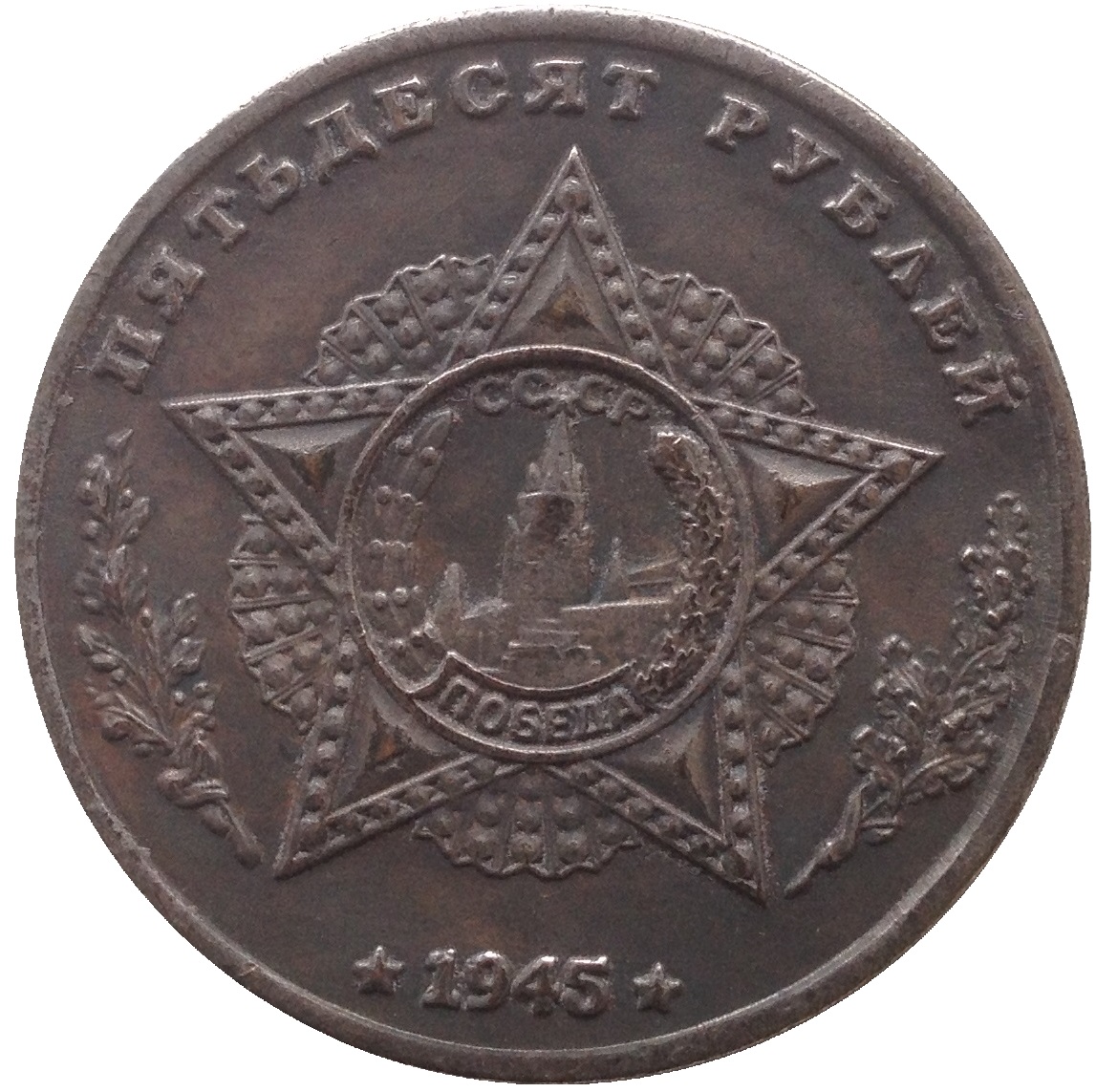 Опис: Номінал зверху; Орден Перемоги, а в його центрі зображені стіна Московського Кремля, Спаська вежа та Мавзолей Леніна, оточені лавровими та дубовими гілками; рік внизу.