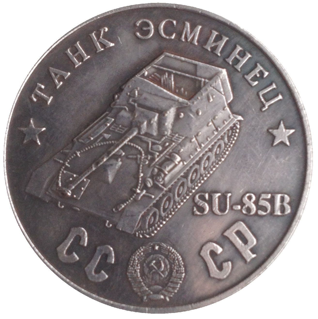 Опис: Назва серії танків зверху; радянський танк-винищувач SU-85В; герб СРСР між літерами CC і CP.