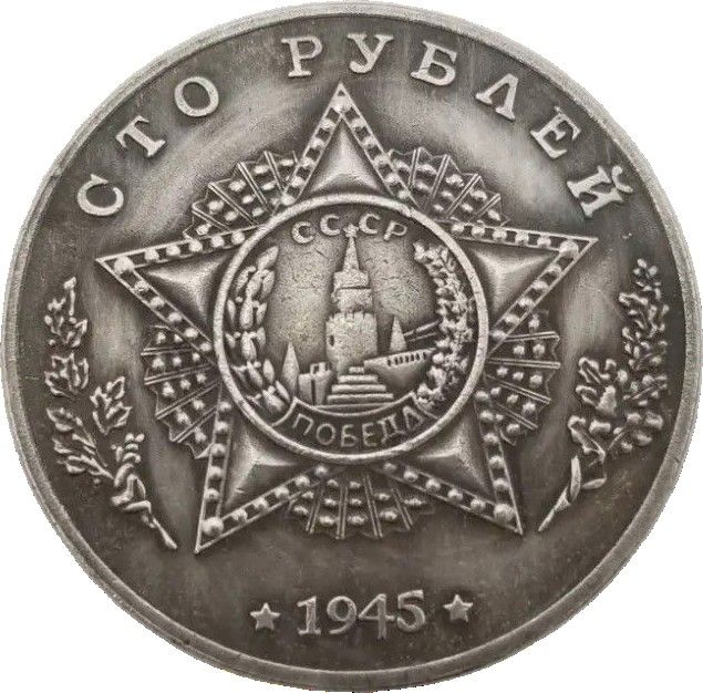 Опис: Номінал зверху; Орден Перемоги, а в його центрі зображені стіна Московського Кремля, Спаська вежа та Мавзолей Леніна, оточені лавровими та дубовими гілками; рік внизу.