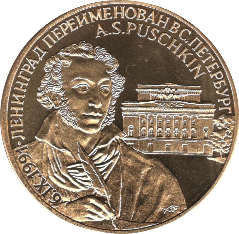 Медаль — Перейменування Ленінграда на Санкт-Петербург (Олександр Пушкін) 1991 – 1991 Радянський Союз