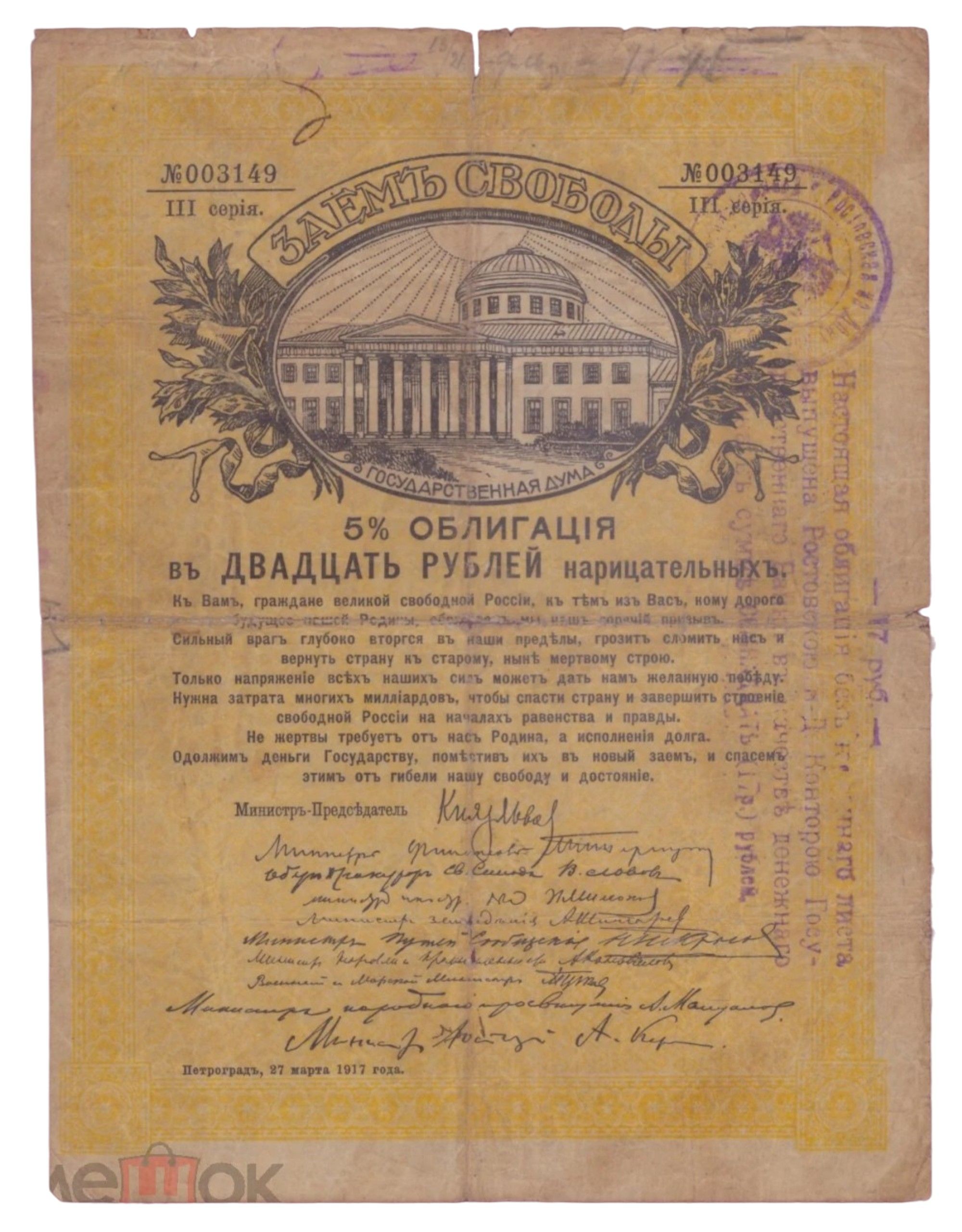 17 рублів (5% облігація свободи — тип 3) 1918 – 1920 Ростов-на-Дону, місто
